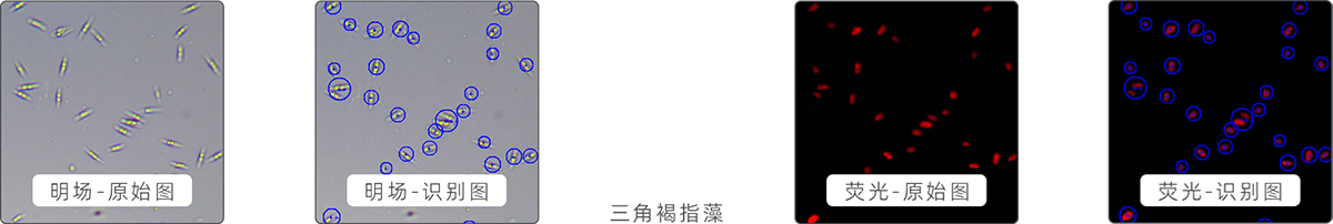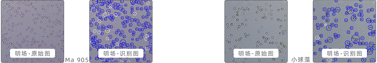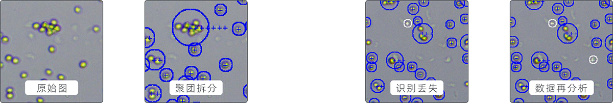 軟件算法可對采集的細胞圖像中的聚團細胞進行智能化的自動拆分,提高細胞計數的準確性;當結果的細胞圖像出現部分細胞識別丟失時,可自定義軟件識別參數,對計數結果進行再識別分析(案例細胞圖為小球藻)。