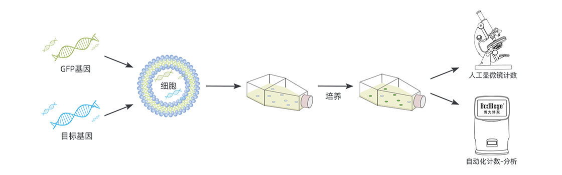 進行轉染實驗時,在連接GFP基因與目標基因后,通過將這些基因導入細胞,研究人員可以利用GFP的熒光特性來跟蹤目標基因在細胞內的表達情況。這可以通過熒光顯微鏡觀察和計數綠色熒光的GFP細胞數量來實現。